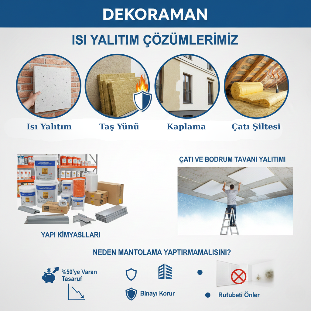 Dekoraman olarak, binalarınızı sadece soğuktan korumakla kalmıyor; yazın serin, kışın sıcak, rutubetten uzak sağlıklı yaşam alanları oluşturuyoruz. İster projeniz için toptan malzeme temin edin, ister anahtar teslim uygulama hizmetimizden yararlanın; en doğru yalıtım paketini sunuyoruz.